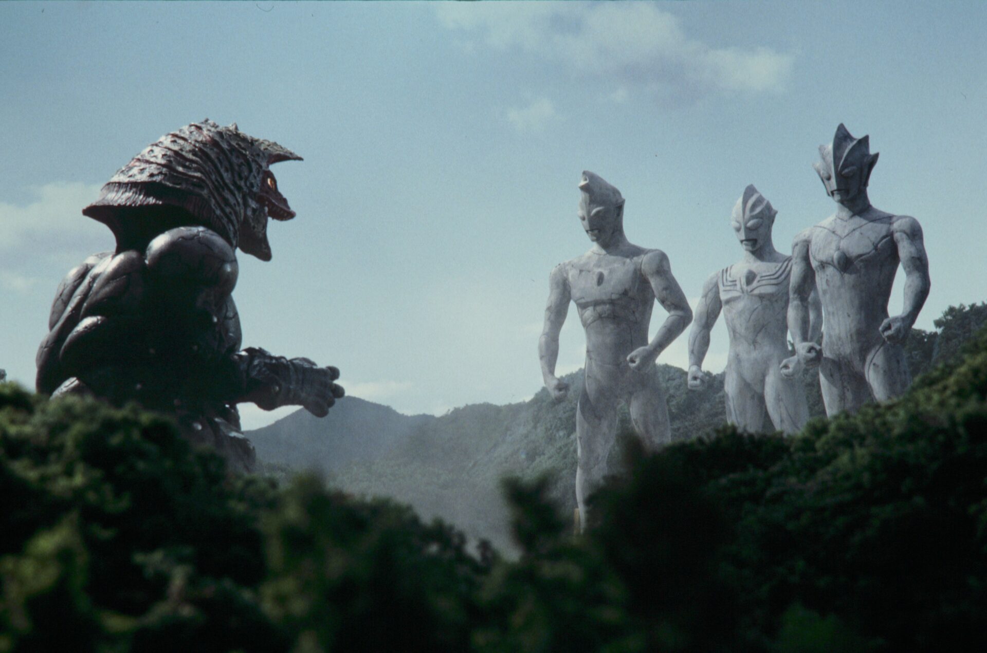 The remaining statue was reawakened as Ultraman Tiga and sprang into battle. Melba and Golza’s coordinated attack challenged Tiga at first, but then he transformed into Power Type. Tiga’s beam sent Golza flying, and it fled back underground.