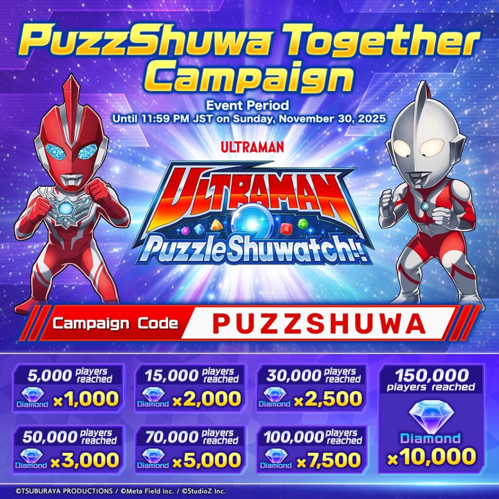In this campaign, all registered users will receive an immediate gift of 3,000 Diamonds by entering the campaign code “PUZZSHUWA” into the dedicated input screen within the game. Furthermore, additional Diamonds will be presented as a collective reward based on the cumulative number of code entries. The application progress and reward achievement status will be announced periodically through the official X account.